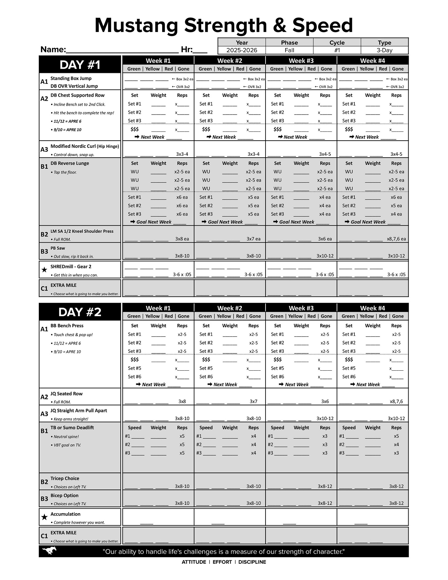 We program with simple linear progressions because they fit the school environment and our training age.